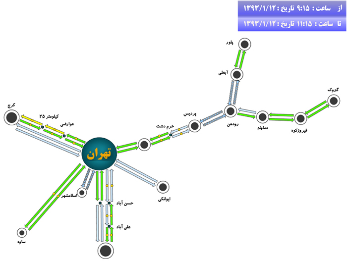 جاده های خروجی از تهران نیز شامل اتوبان قم، جاده هراز و چالوس بدون ترافیک گزارش شده است. فقط در جاده چالوس در مسیر شمال به جنوب حدفاصل مرزن آباد تا گچسر ترافیک نیمه سنگینی برقرار است.