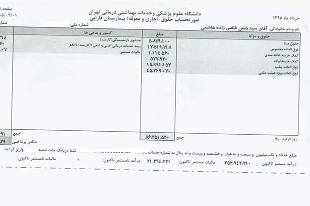 جعفریان در ادامه افزود: در جایی دیدم یک فیش حقوقی وجود دارد که با مبلغ ۲۲۸ میلیون تومان منتسب به وزیر بهداشت عنوان شده است. وزیر بهداشت چون عضو هیئت علمی دانشگاه علوم پزشکی تهران است و ابلاغ وی را بنده امضا می کنم تاکید می کنم که ایشان حقوق ۸ میلیون تومانی قبل از کسر مالیات از دانشگاه دریافت می کند و هیچ گونه پرداخت دیگری به ایشان در دانشگاه و وزارت بهداشت صورت نمی گیرد و از نهاد ریاست جمهوری نیز مبلغی به عنوان فوق العاده مدیریت در حد ۴ میلیون تومان دریافت می کند.