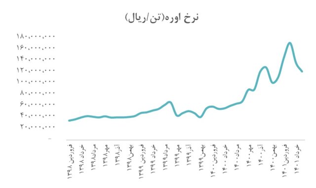 نمودار زیر به بررسی روند قیمت ریالی اوره به ازای هر تن بین سال های ۹۸ تا ۱۴۰۱ پرداخته است.