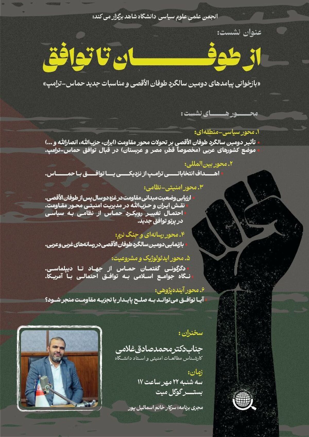 نشست مجازی با موضوع بازخوانی پیامد های دومین سالگرد طوفان الاقصی و مناسبات جدید حماس/ترامپ