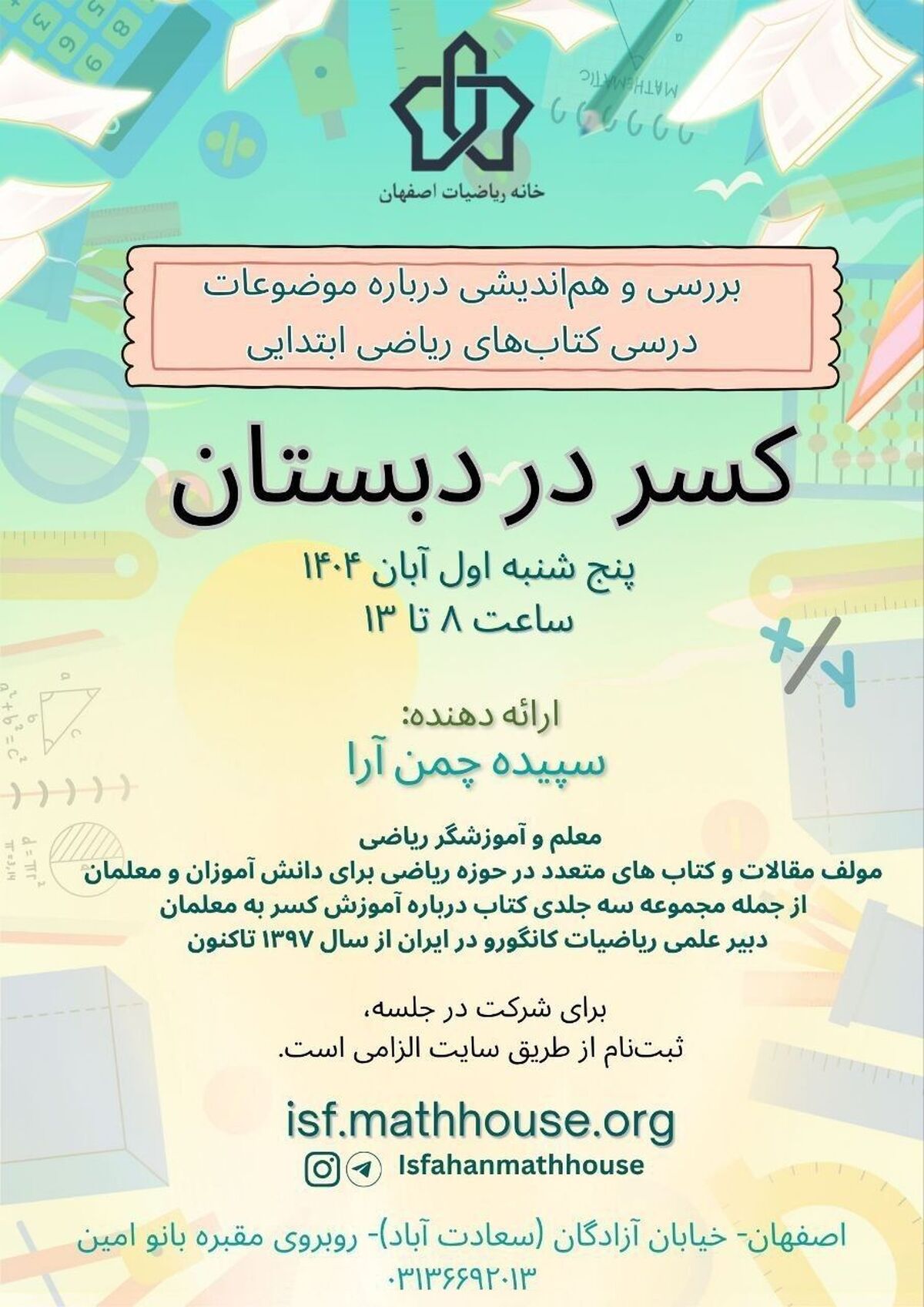 «کسر» همواره یکی از چالشبرانگیزترین موضوعات در آموزش ریاضی در مقطع ابتدایی بوده و هست، و این چالش، تنها مختص به ایران نیست. در این کارگاه یکروزه، که برای معلمان ابتدایی برگزار میشود، قصد داریم به موضوعات مهمی که معلمان برای آموزش مفهومی کسر و عملیات با کسرها باید به آنها توجه کنند، بپردازیم.