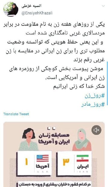 خزعلی همچنین موشن با عنوان بخش کوچکی از روزمرههای زن ایرانی و آمریکایی است منتشر کرد و گفت: شکر خدا که زنی ایرانیم.